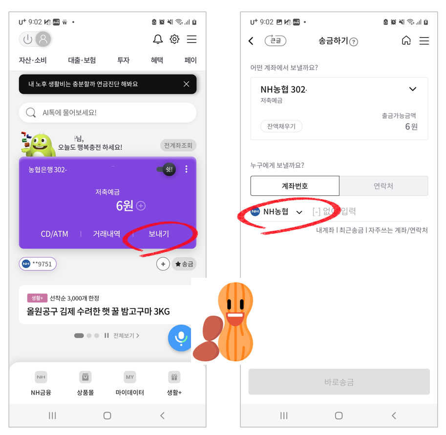 1. NH올원뱅크 메인 화면에서 [보내기] 를 선택합니다.