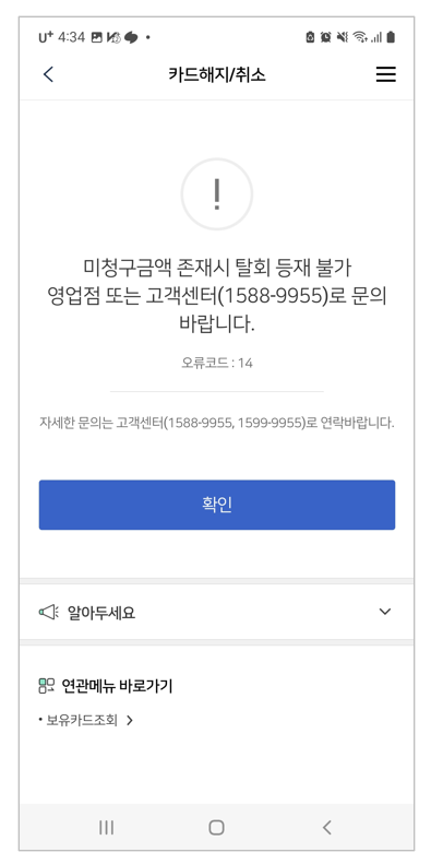 단, 해지하고자 하는 카드에 아직 결제할 금액이 남았다면 바로 해지가 되지 않아요.